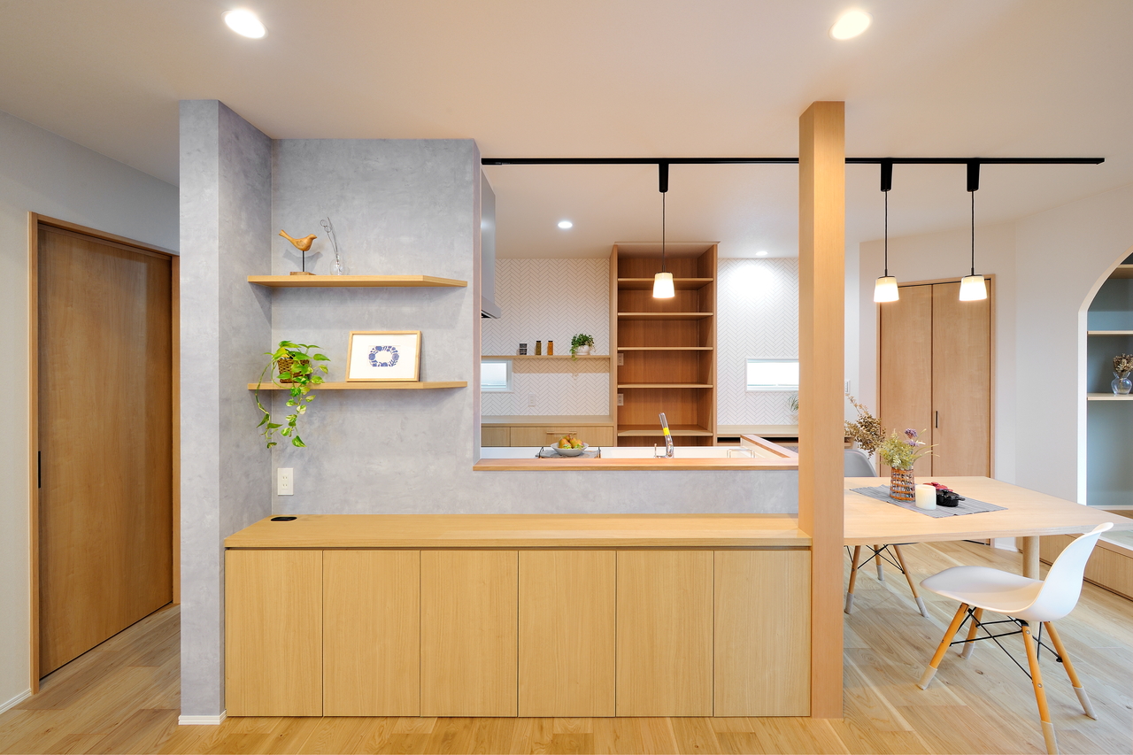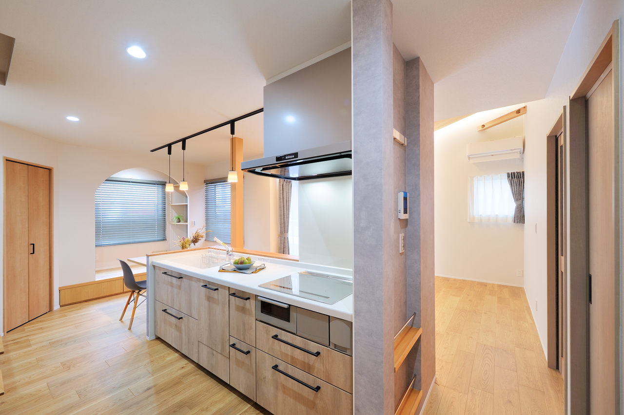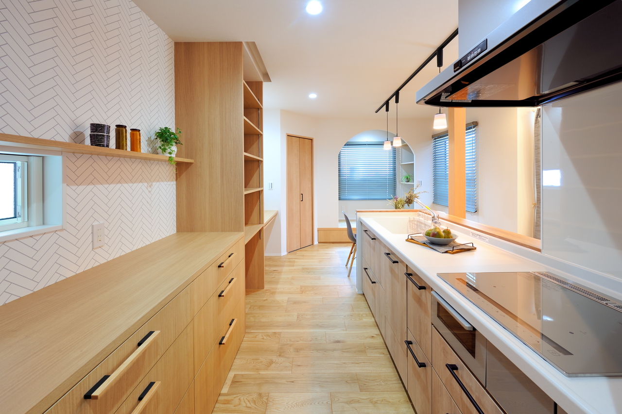 つながるキッチン リビングや庭まで目が行き届く家の真ん中 水回りとの家事導線もバッチリで動きやすい