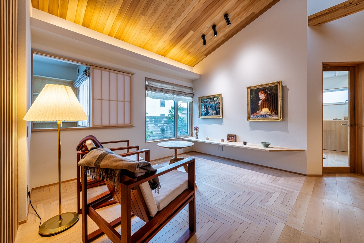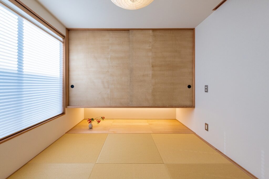 和紙貼りの襖・吊収納の下に仕込んだ間接照明が、落ち着いた雰囲気を作る