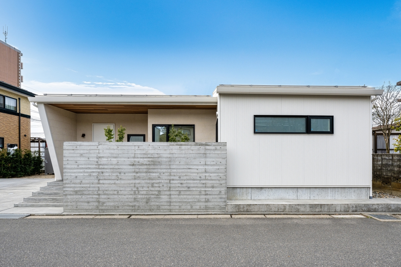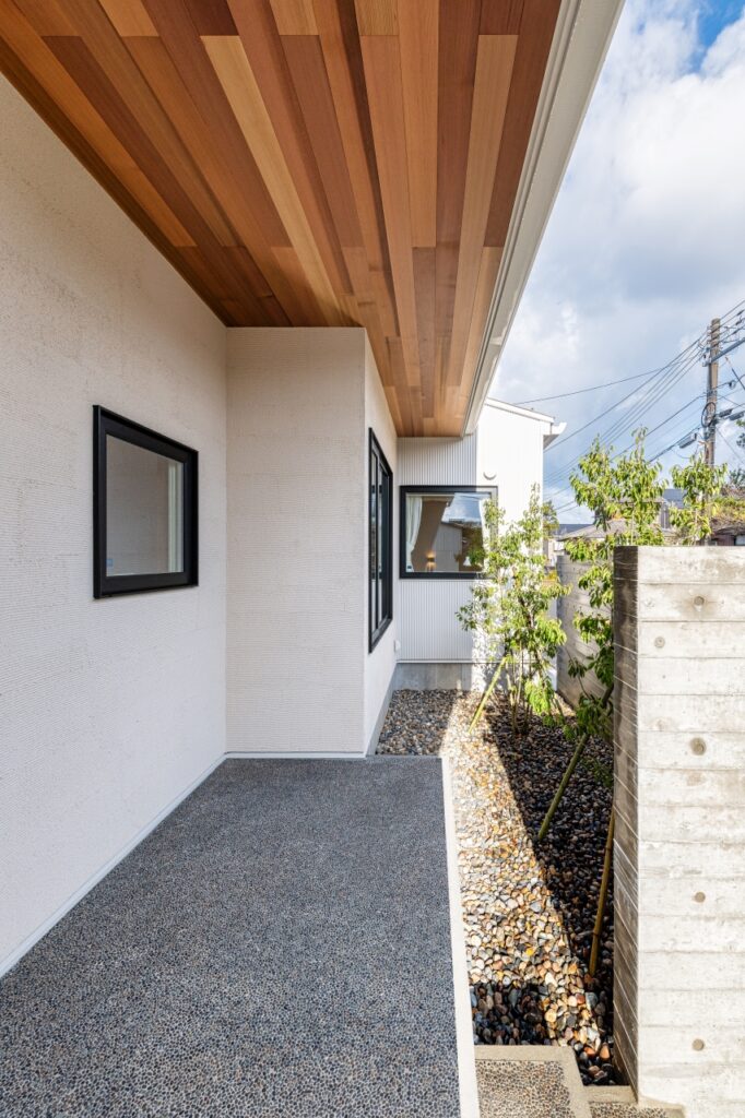 杉板型枠のRC塀と植栽、軒天の米杉がアクセント