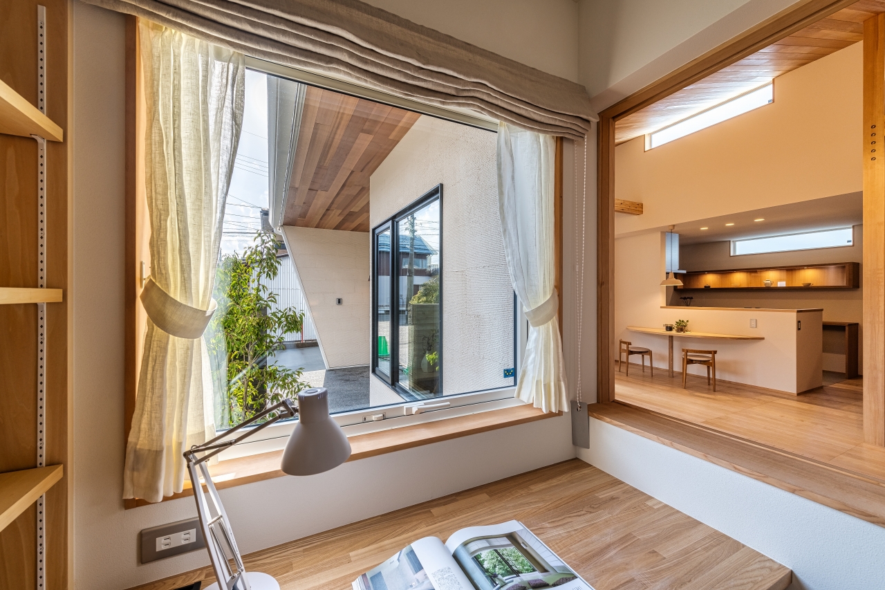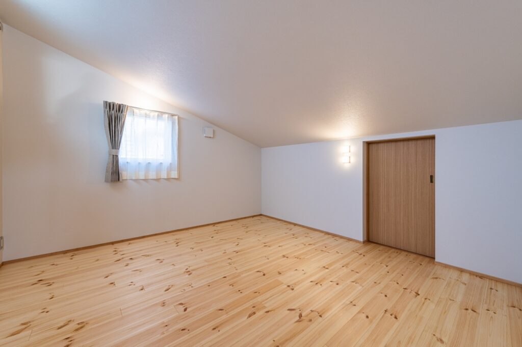2階に一つだけ設けた子ども室は、ボリュームを抑えた外観を損なわないよう、屋根なりの勾配天井とした