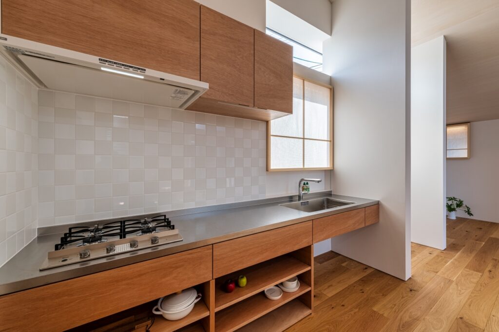 ラワンの造作キッチン、正面は白タイルのツヤありとマットを市松にした組み合わせ