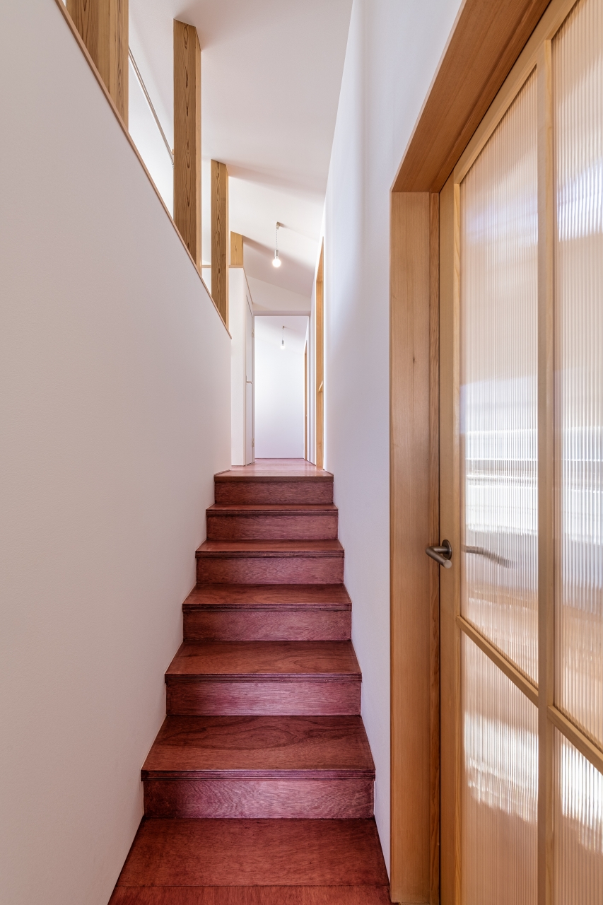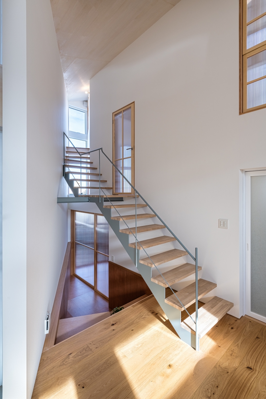 1階から小屋裏収納まで登っていくスチール階段、上からは街並み・海が眺められる