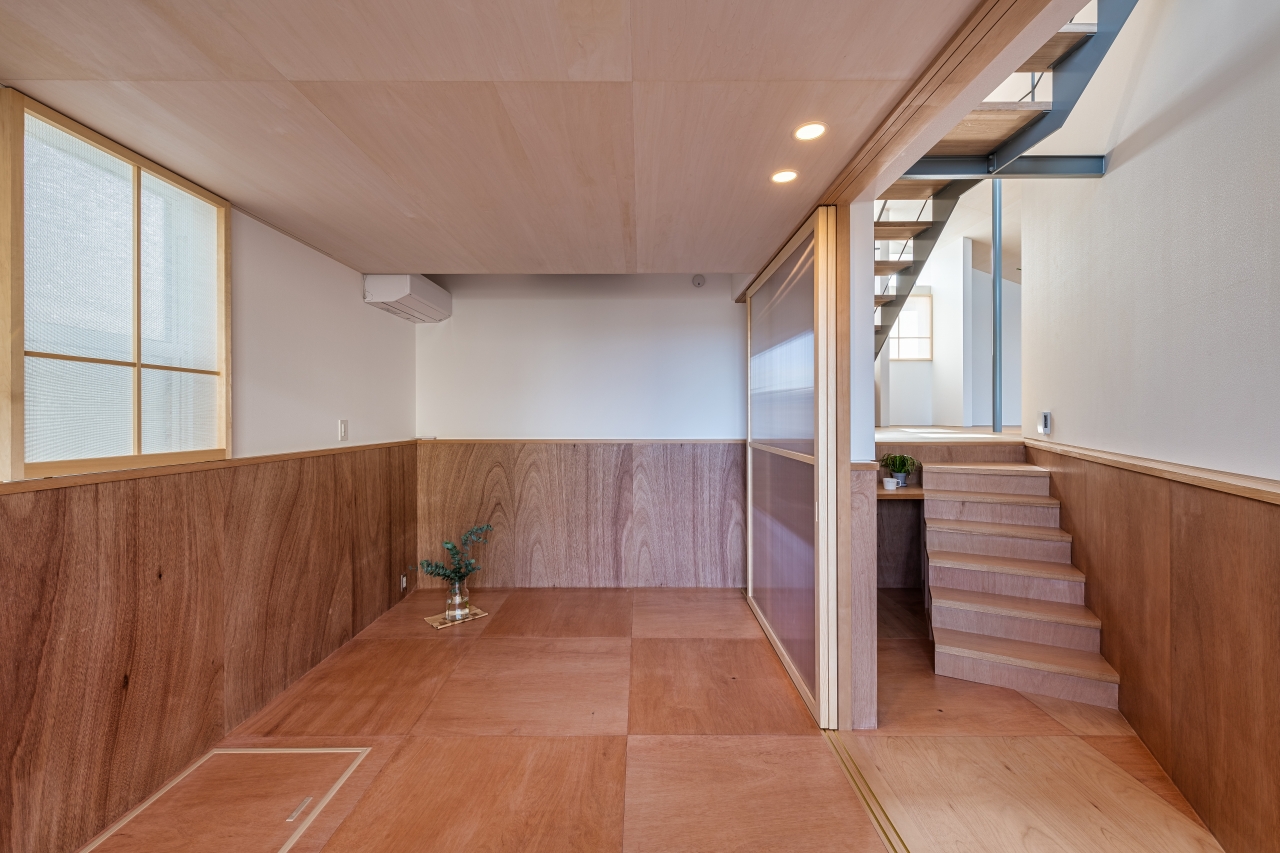 ラワンの床・壁、シナの天井で落ち着いた半地下の寝室。扉をオープンにするとLDKと一体に