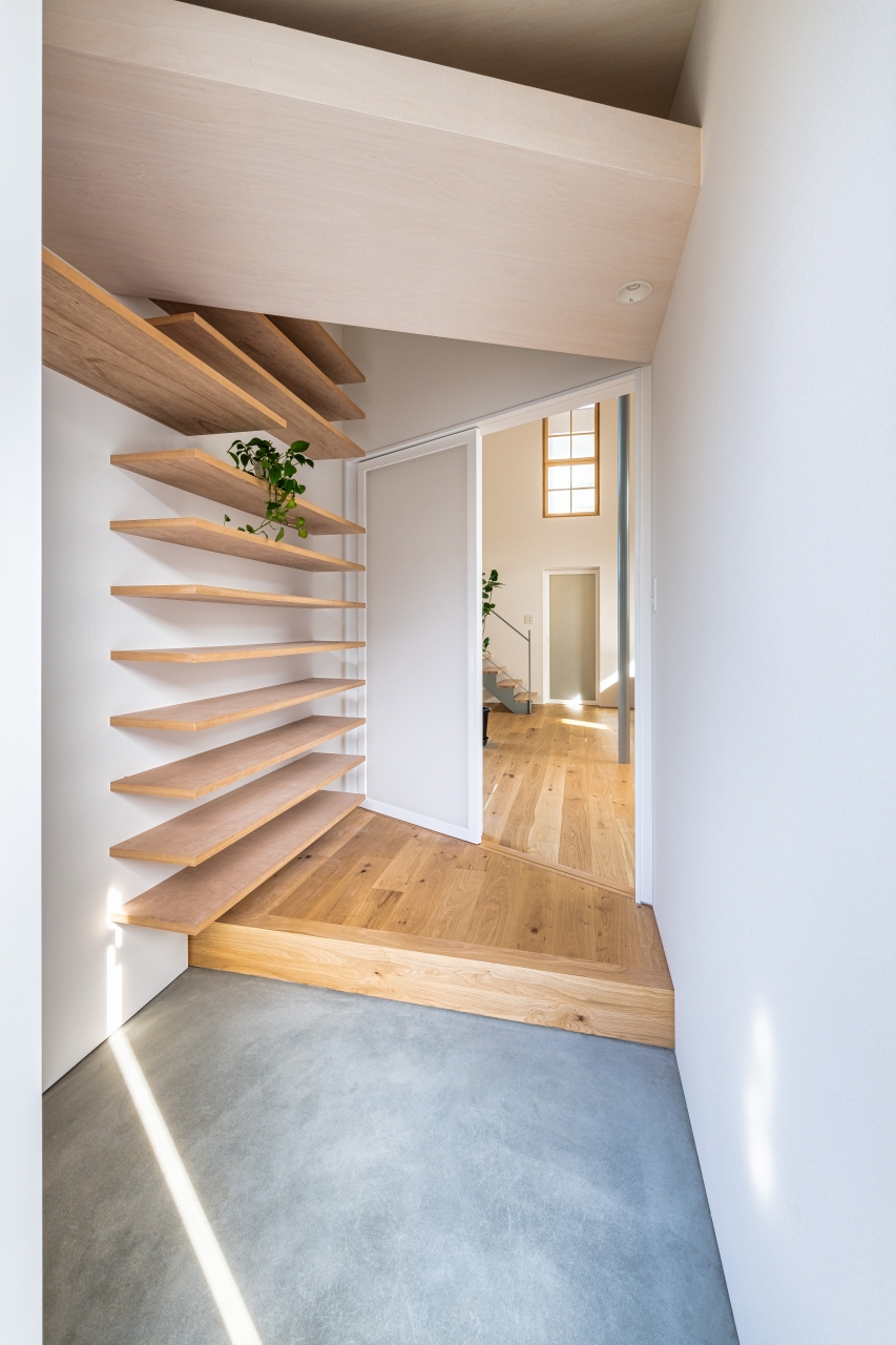 オープンな収納棚、エアコン配管を隠すため斜め天井をアクセントに入れる