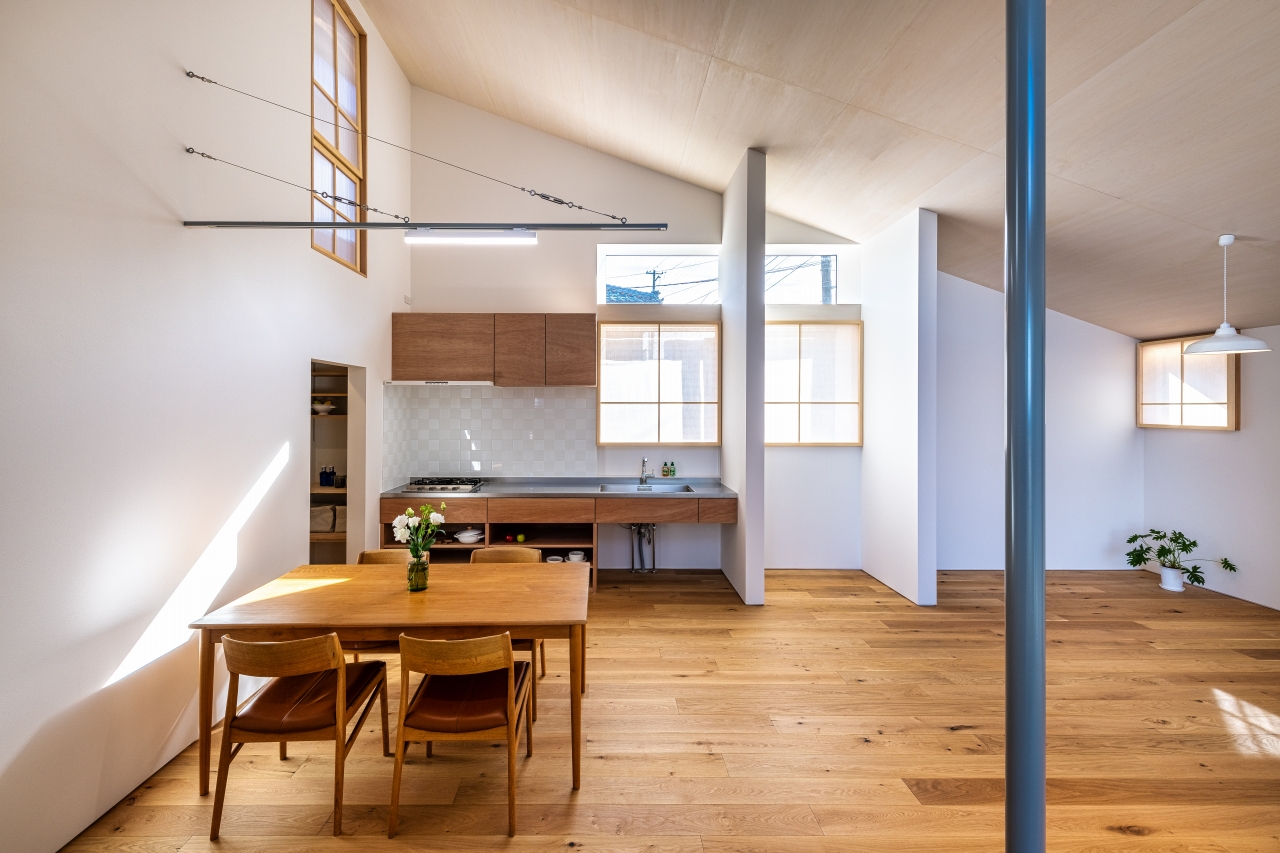 シナの勾配天井と全開口サッシを使った、中庭に視線が抜けるダイナミックなLDK