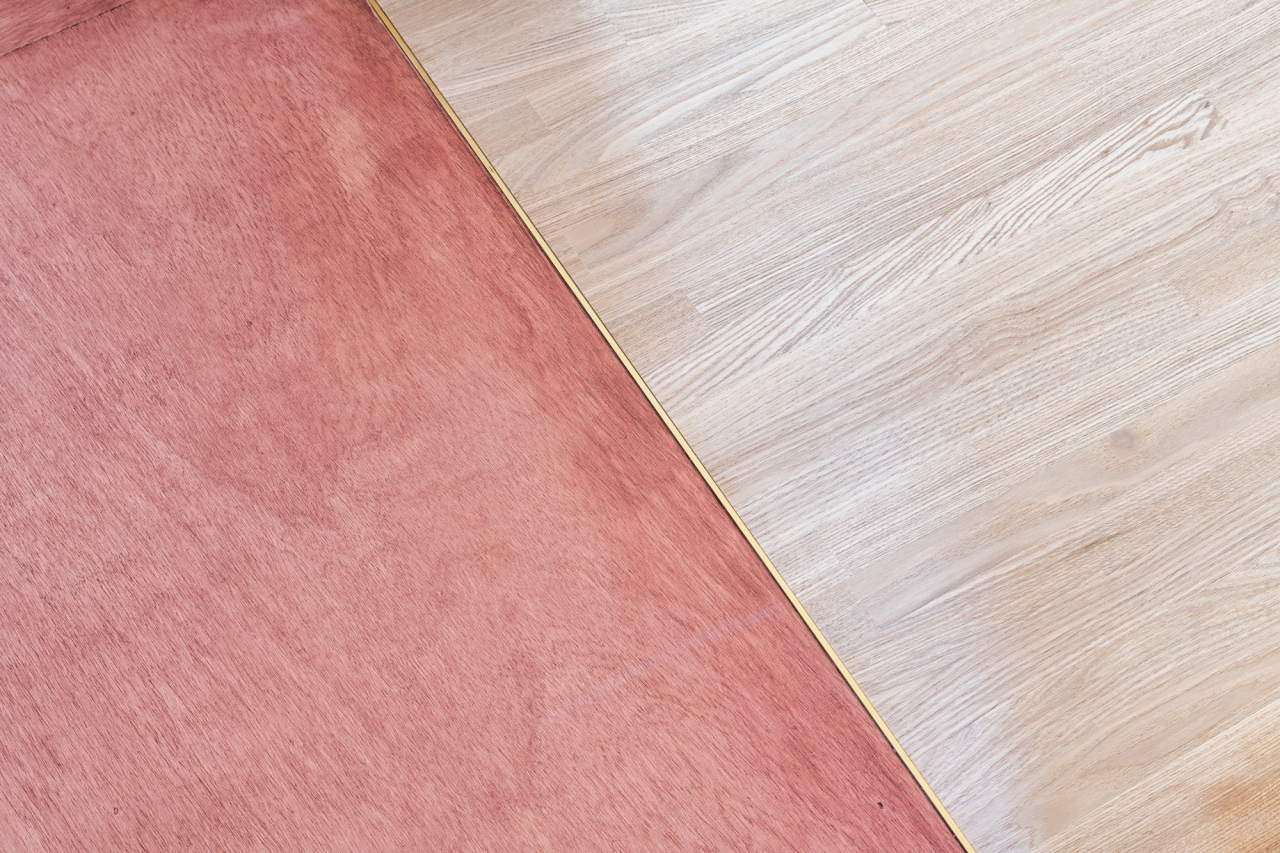 床の異素材がぶつかる境界に、真鍮の見切を使用