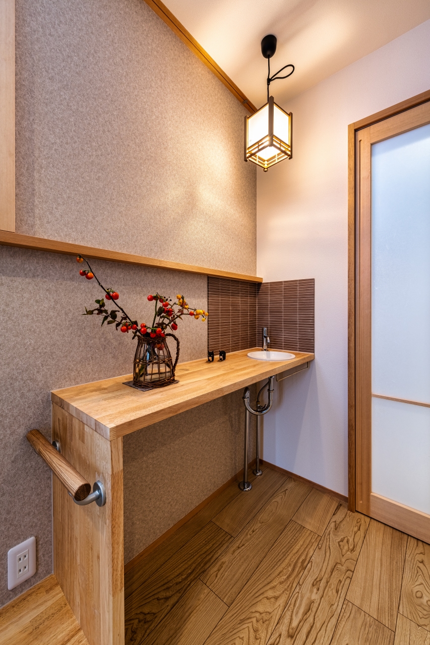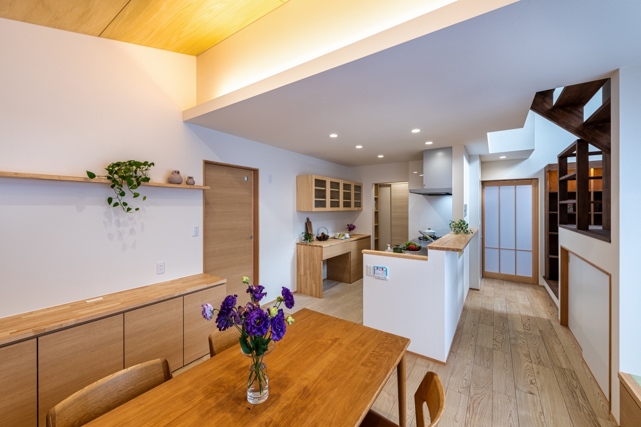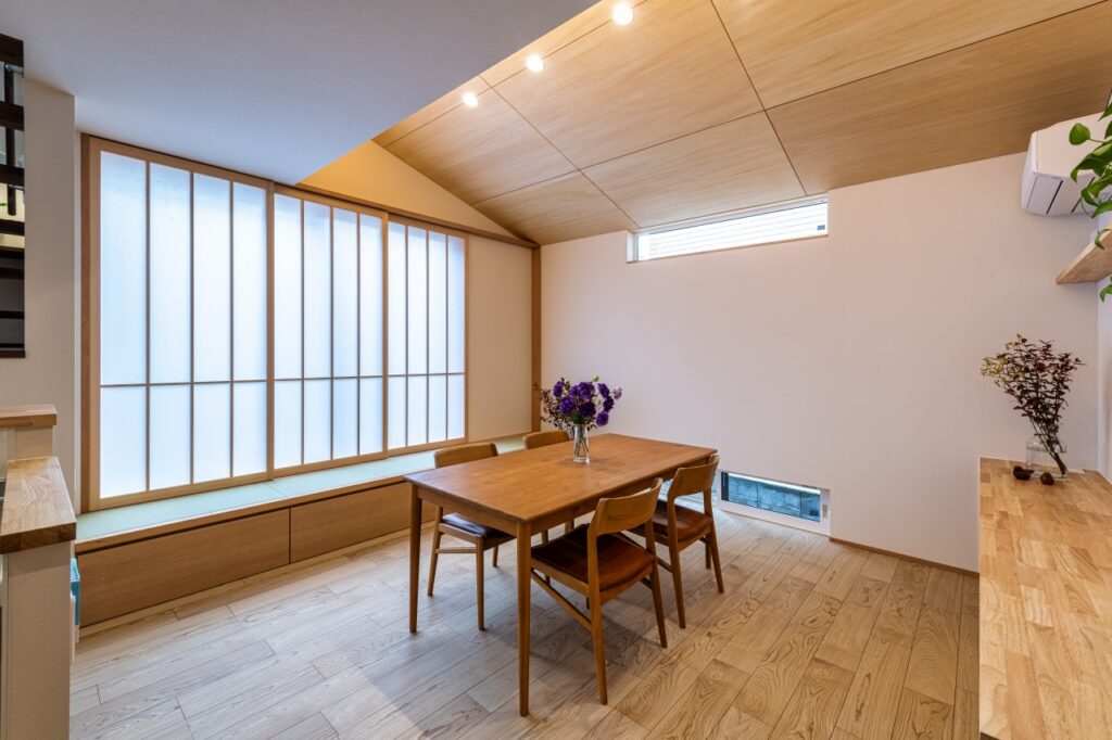 シナ天井と畳ベンチ、格子建具が織りなす落ち着いたリビングダイニング