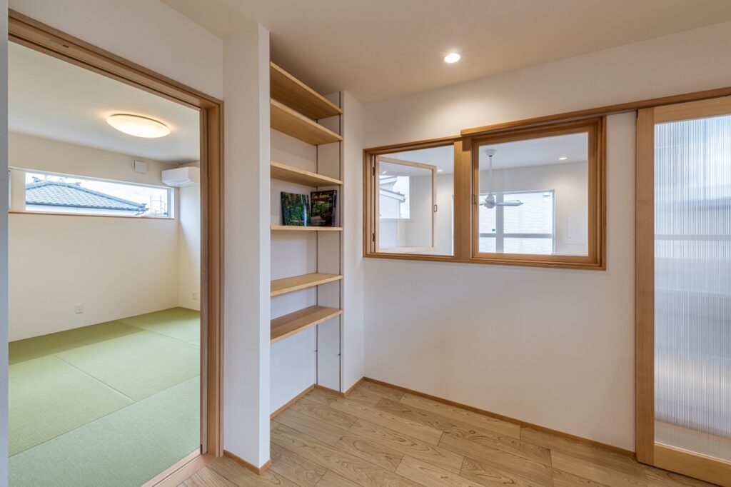 内窓でスキップフロアとつながる。左手には畳敷きの寝室
