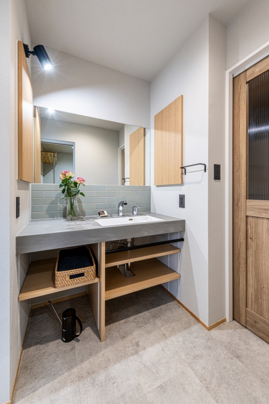 両サイドに壁面収納を作りスッキリとした造作洗面化粧台