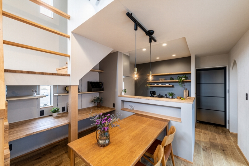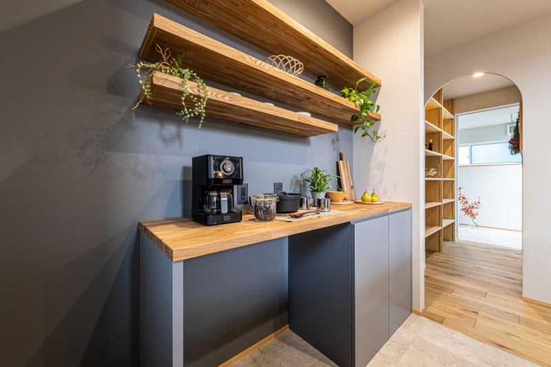 グレートーンでまとめ、飾るものに合わせて高さを調整した造作食器棚