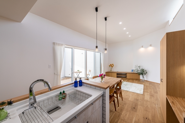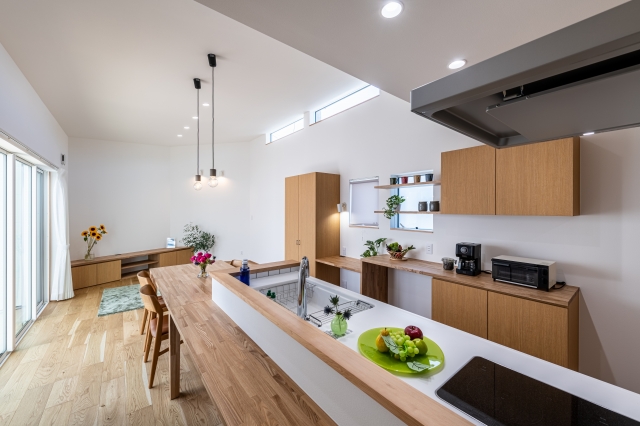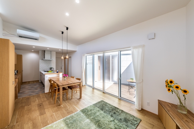 勾配天井の開放感+中庭に抜ける視線で広がりを感じるLDKに