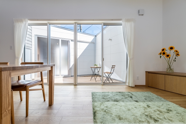 中庭とハイサイドライトから優しく光を取り込むLDK