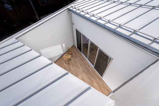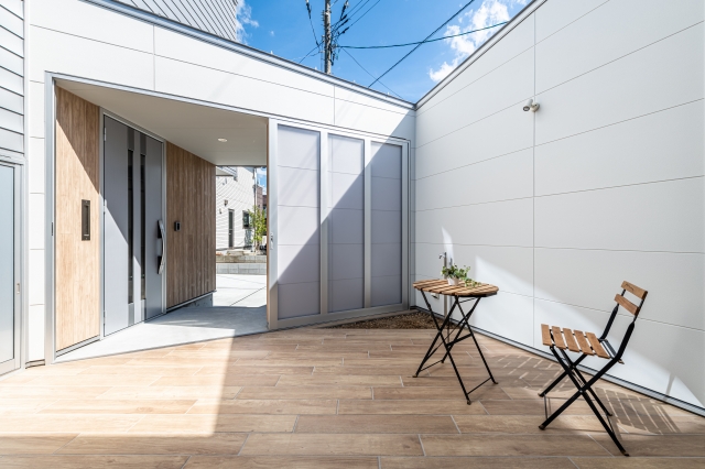 角地の明るさと開放感を活かしながら、壁で視線をコントロールしたプライベートテラス