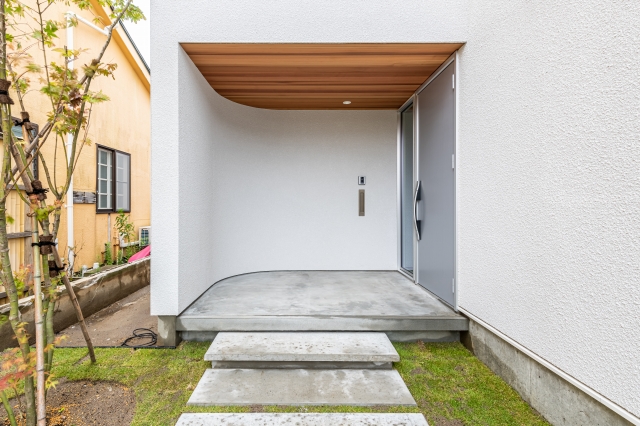 R型の塗り壁に誘われる玄関ポーチ。内と外が連続的につながる