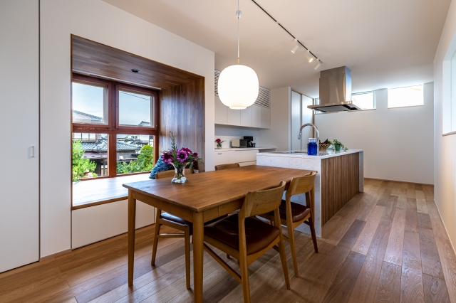 アイランドキッチンと並行したダイニング。チークの出窓ベンチが空間のアクセントに