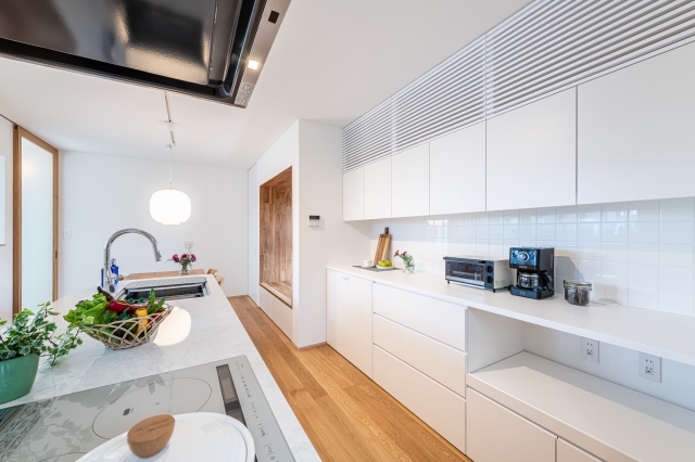 アイランドキッチンと白い造作食器棚