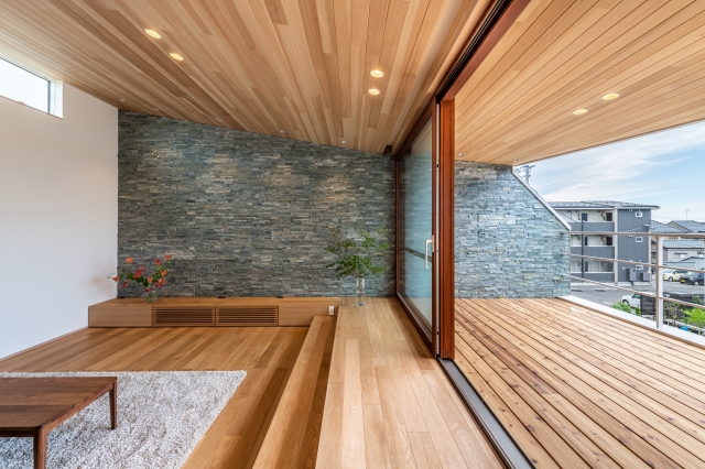 2間半の大開口木製サッシ、アガチスの羽目板、壁面タイルでダイナミックな空間演出のリビング