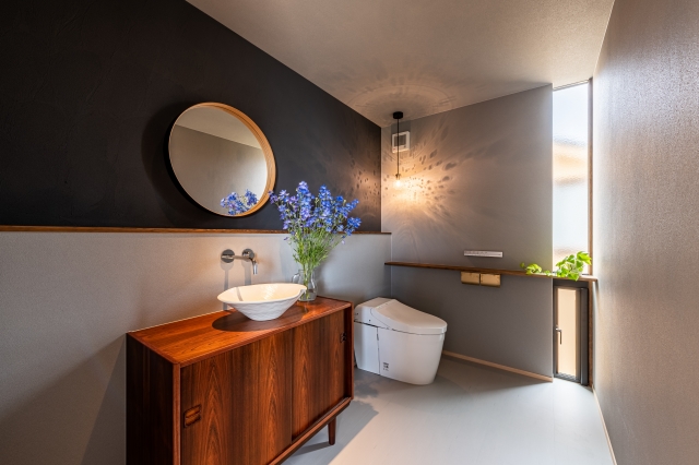 お洒落な造作手洗いとシックなコーディネートでまとめられたゆったりお手洗い