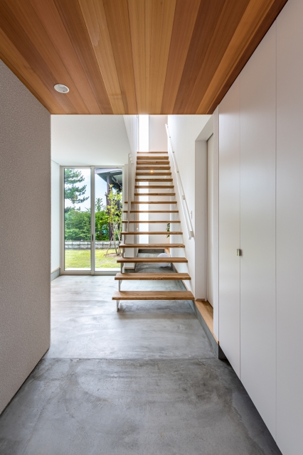 土間で居室をつなぐユニークなつくり。ストリップ階段が更に視界を広げている