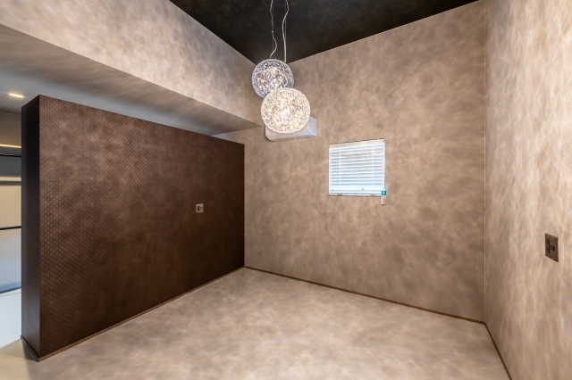 絞られた光は本物の古煉瓦張りの壁やヘリンボーンの床材、