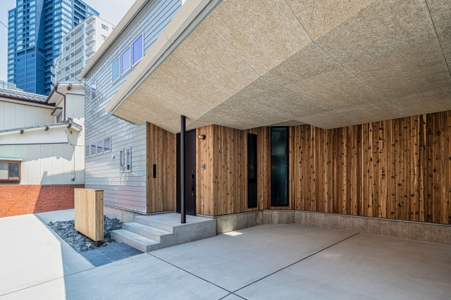 木毛セメント板と木製サイディングを使用した個性的なガレージ