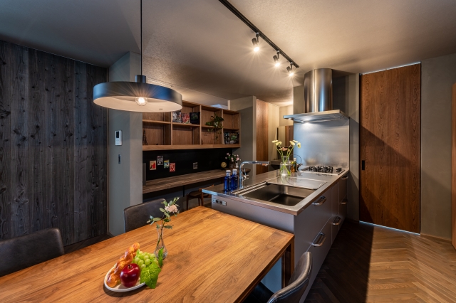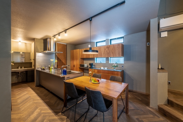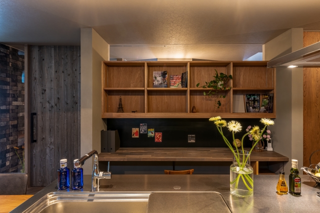 リビングのスキップフロアや、キッチン前にみんなが共有できるカウンタースペース。