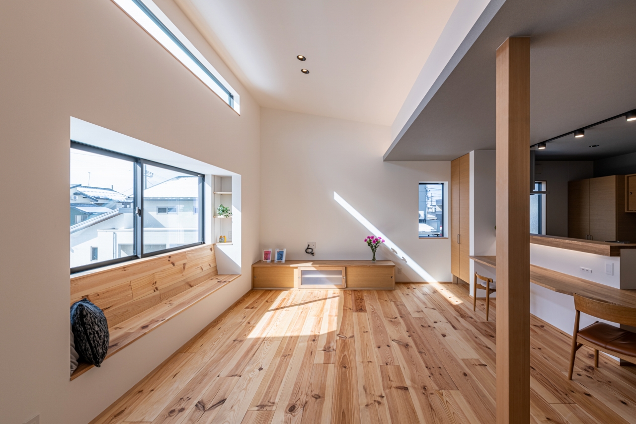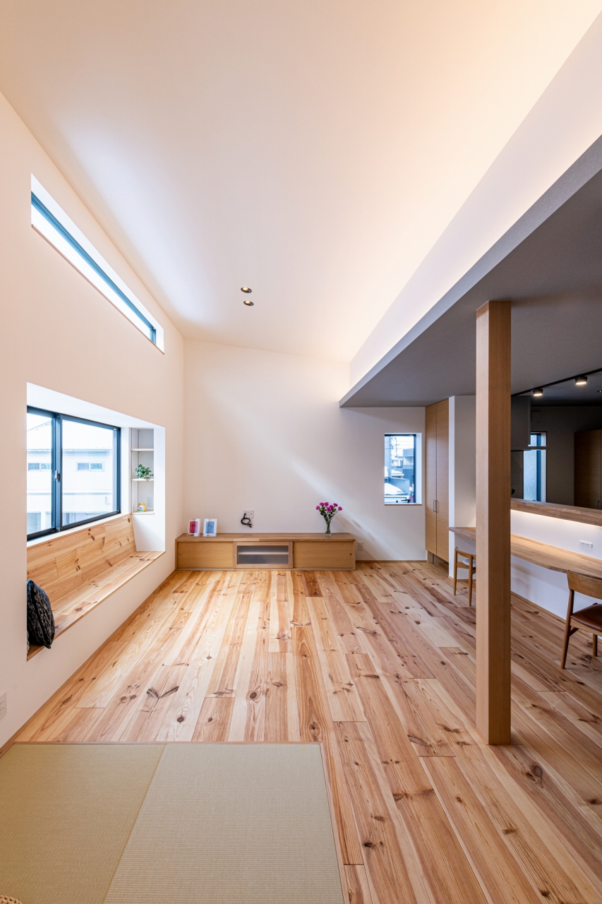 ハイサイドと間接照明で明るく開放的な勾配天井