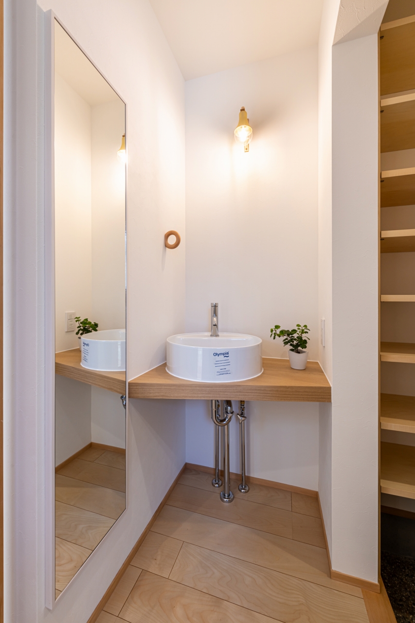 グリーンのタイルで仕上げた造作洗面台。リビングとランマで繋がる。