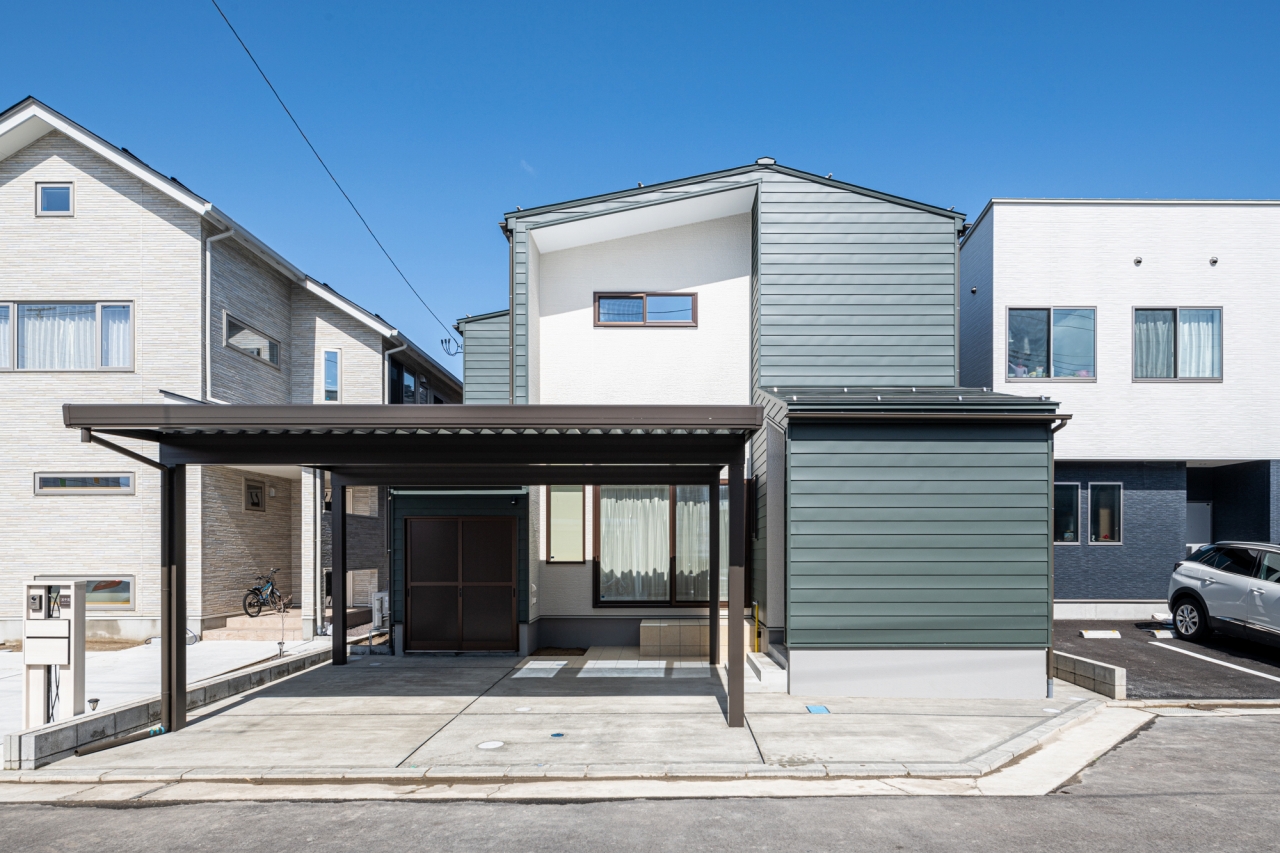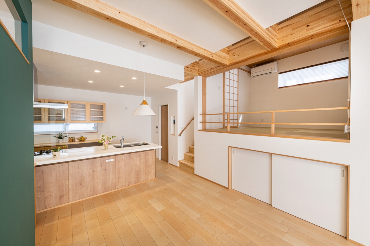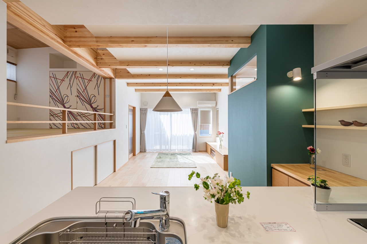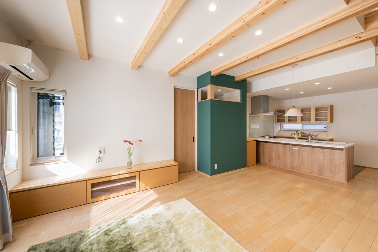 表し梁とグリーンの壁紙がリズムを作る、楽しいリビング。