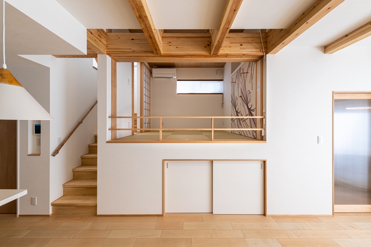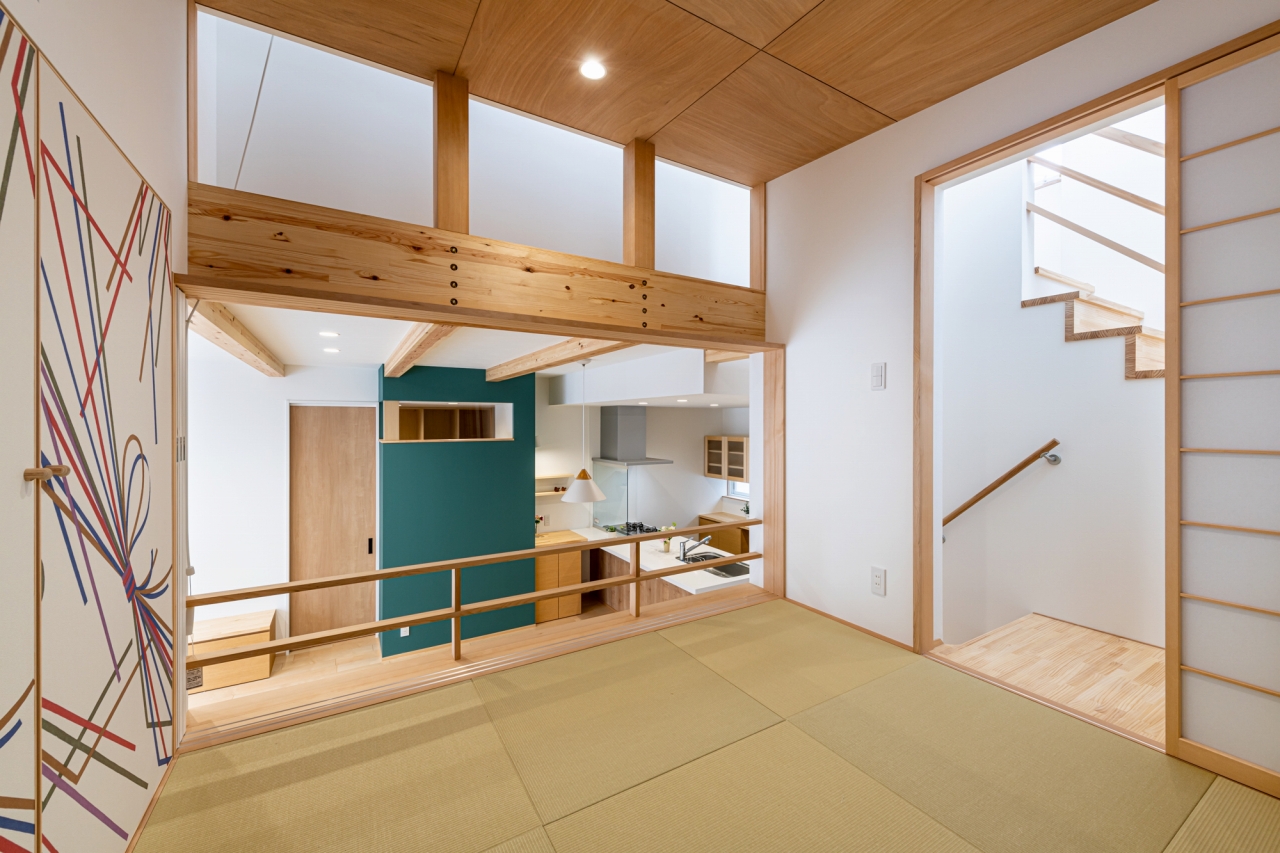 スキップフロアの和室はリビングを見渡せる。リボンの襖紙はご主人のお気に入り。