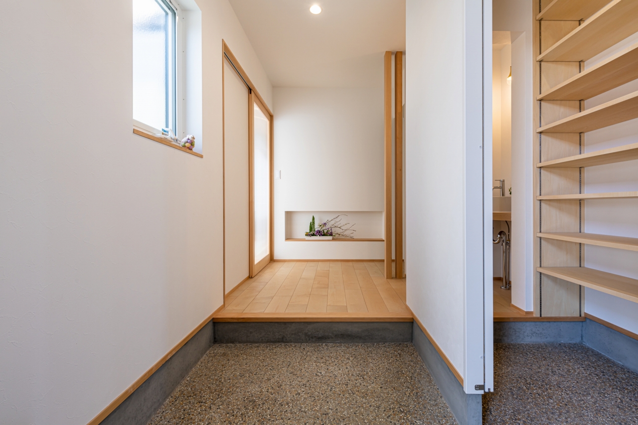 重心を下げたニッチと格子、豆砂利仕上げの玄関。