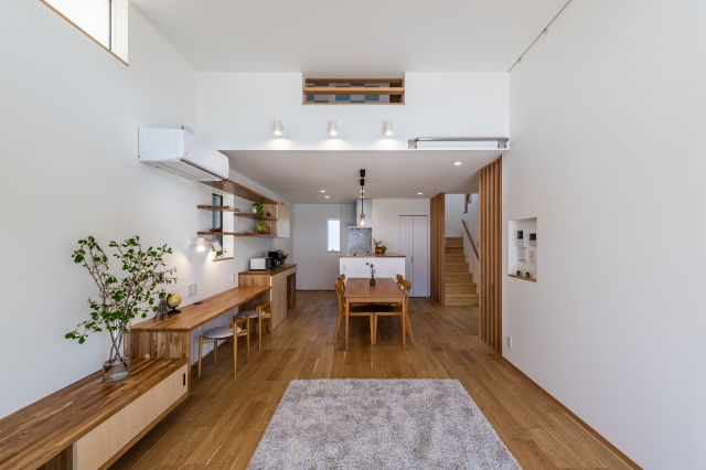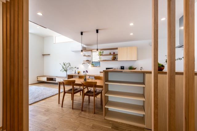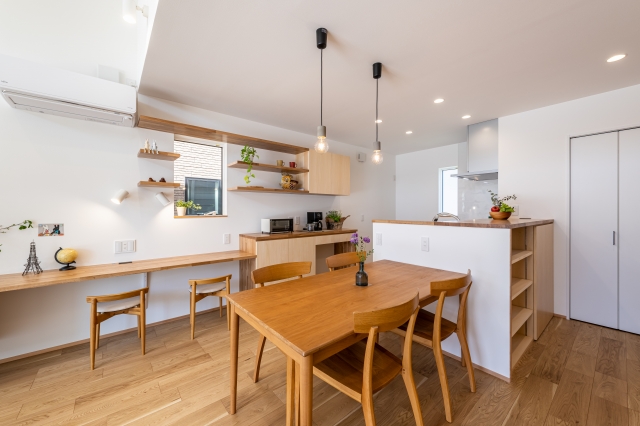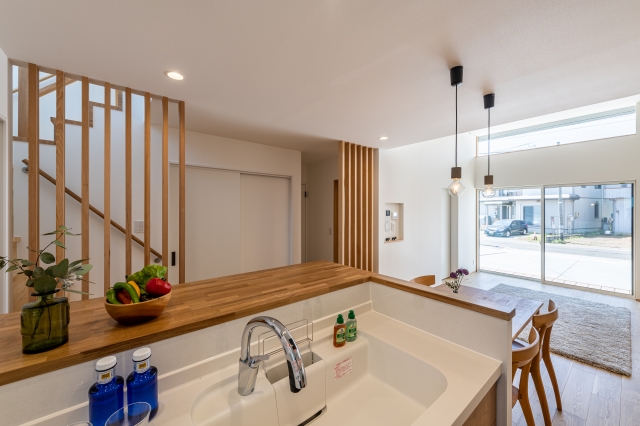 キッチンは、あえてリビング側に作業スペースを向け
