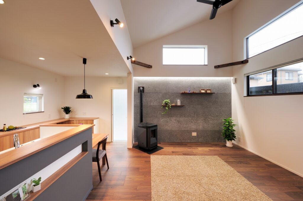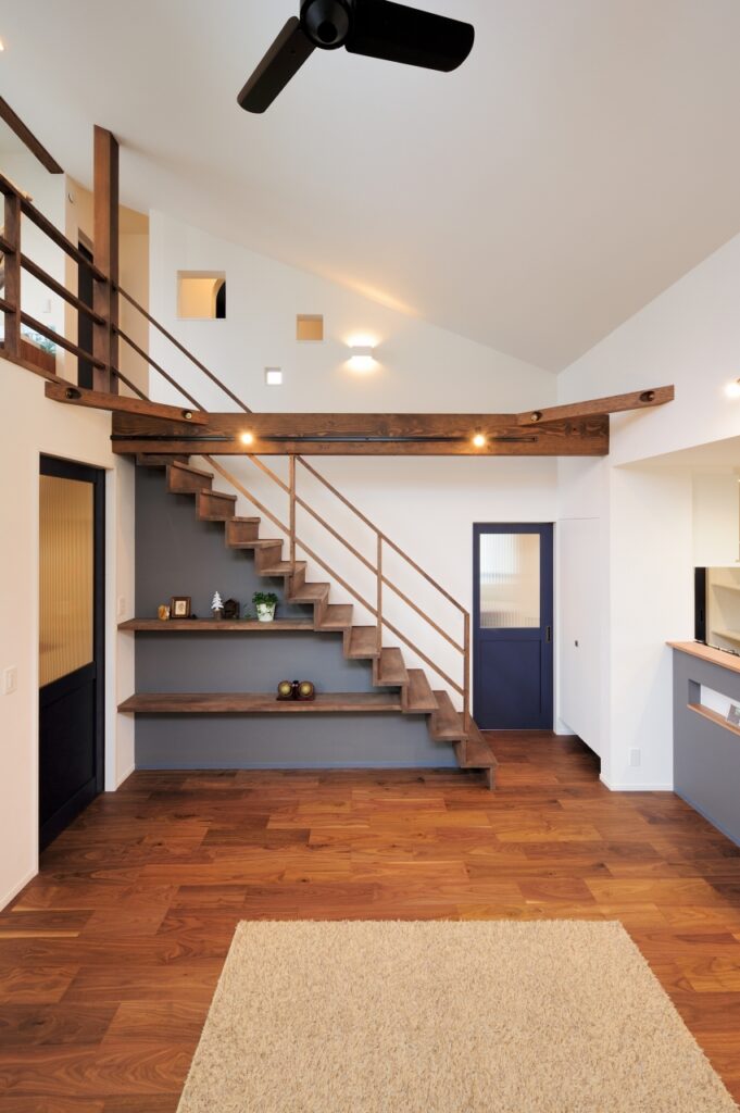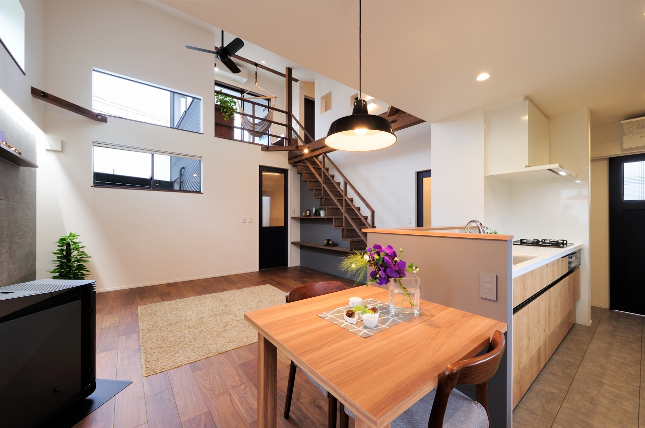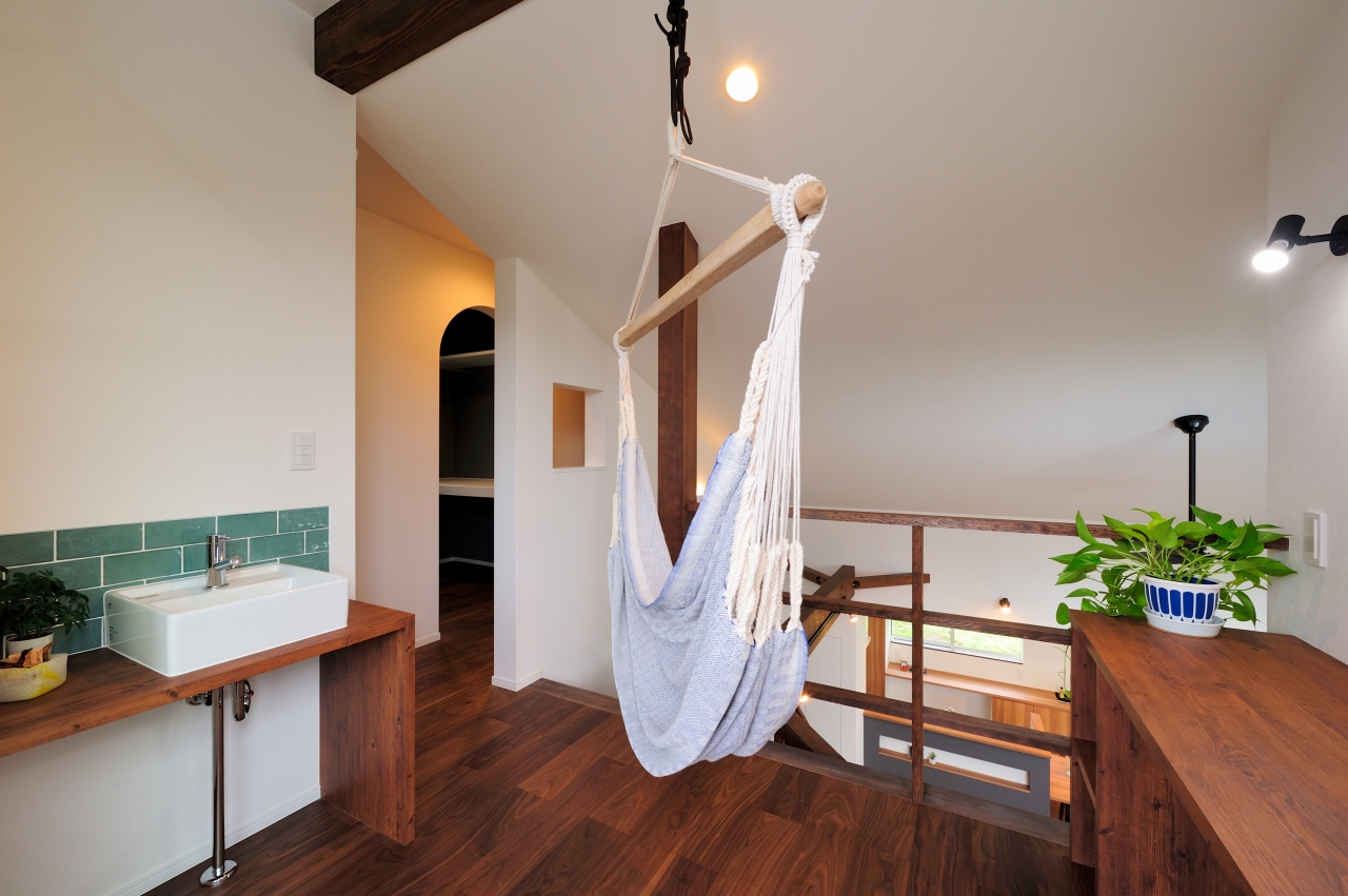 広々したリビングから勾配天井でつながる2階のフリースペースでは、