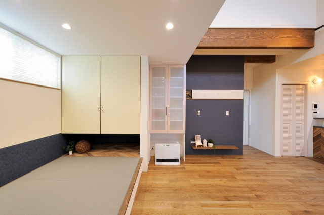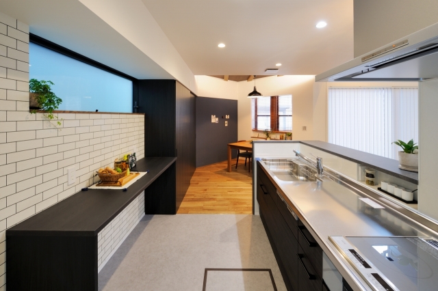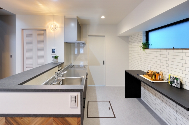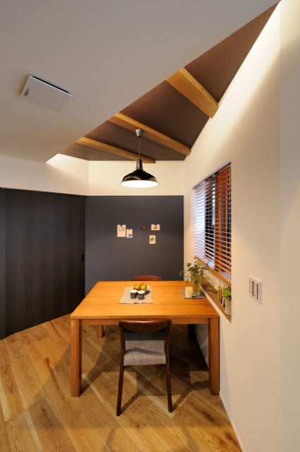 天井の高いリビングで、開放感を楽しもう 角度をつけたダイニングで、食事の目線を楽しもう 庭に出て釣った魚をさばきながら、おうちキャンプを楽しもう