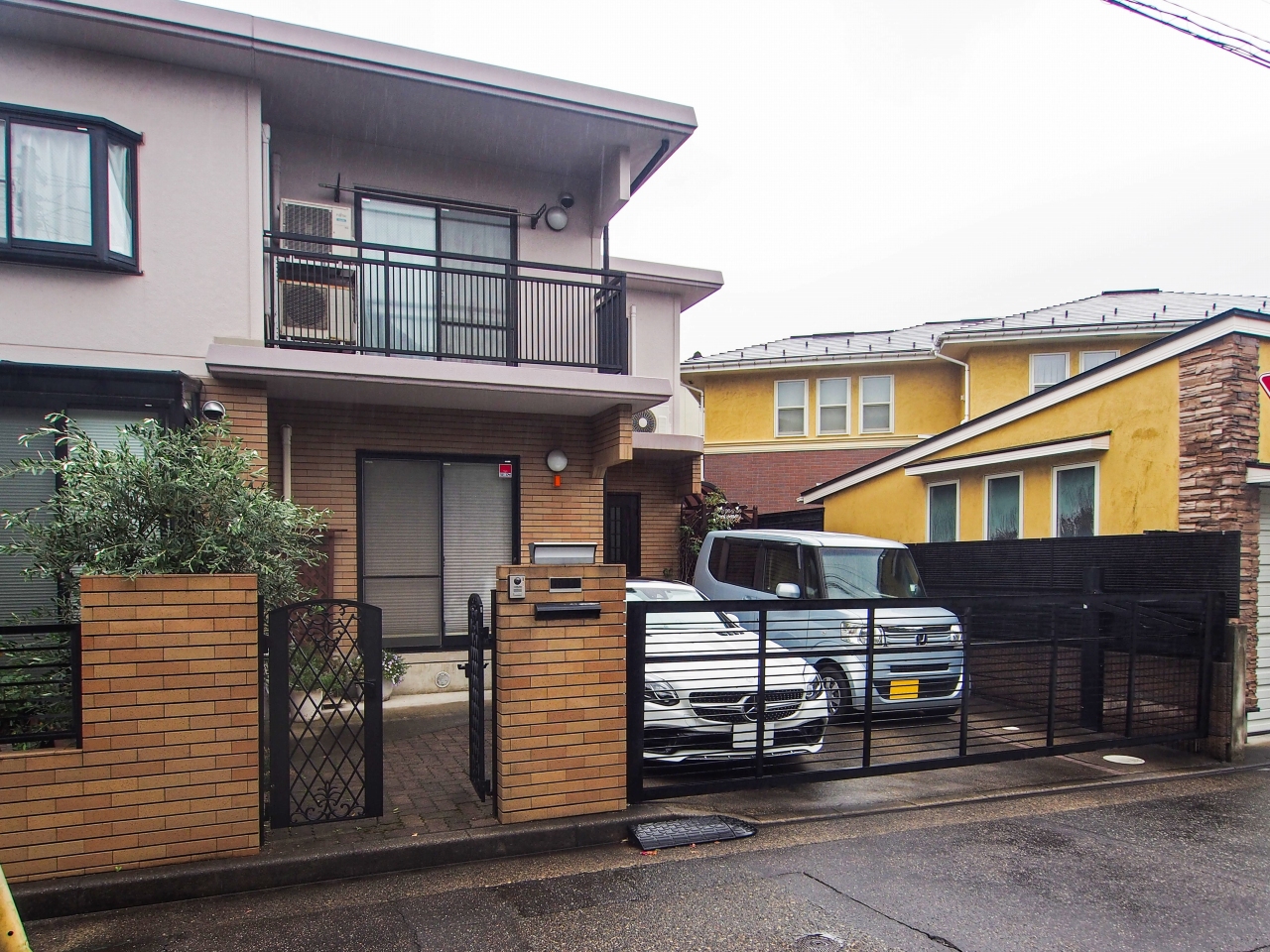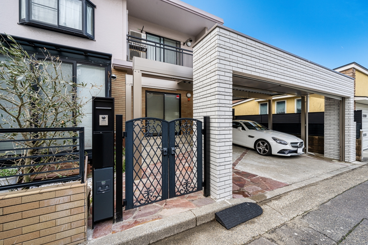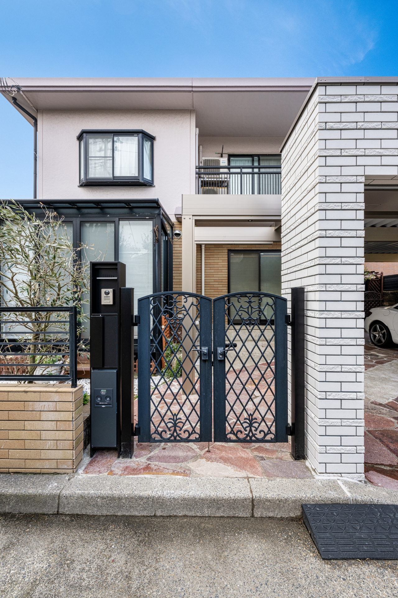 跳ね上げ式ゲートをシャッターゲートへ変更。2種類の白いタイルを貼ることで高級感のある仕上がりに。
