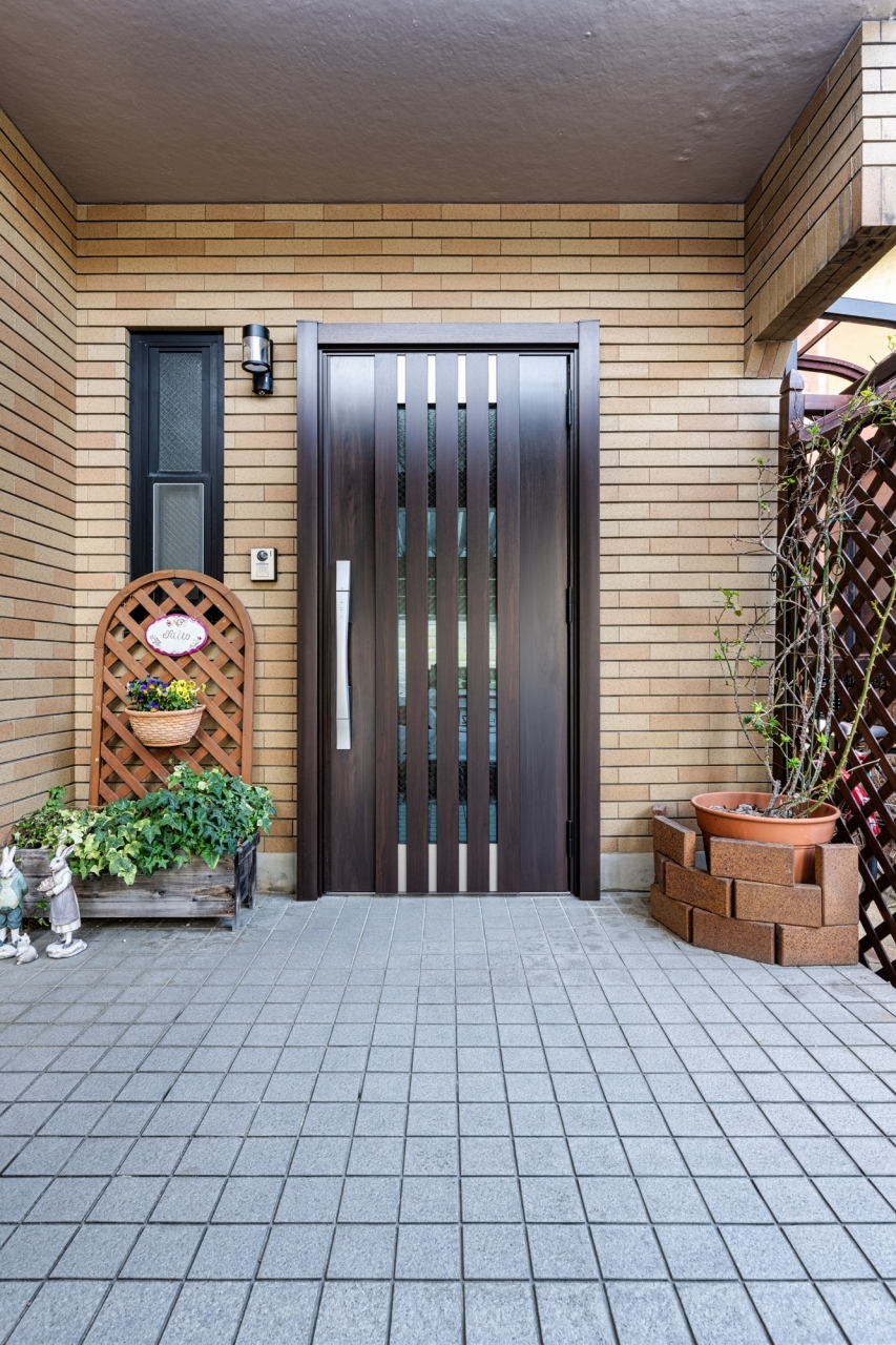 既存玄関ドアの枠を利用したカバー工法で、木調の玄関ドアに一新。断熱効果も高まりました。