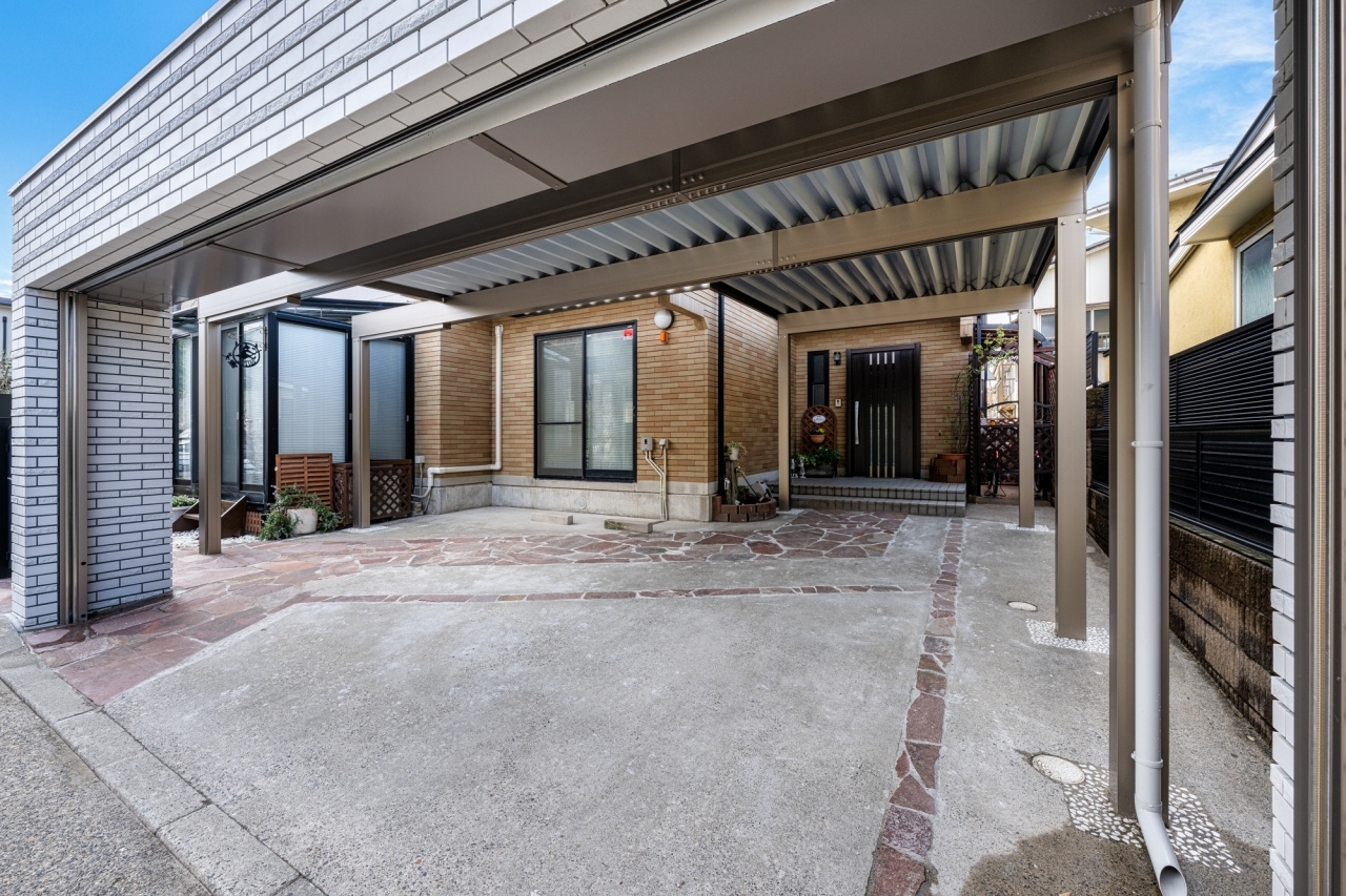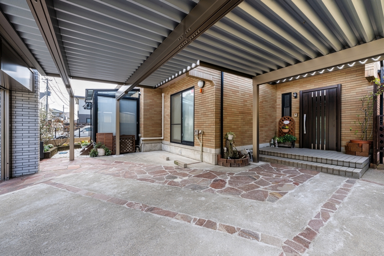 建蔽率ギリギリでカーポートを設置。玄関まで濡れないように、また圧迫感が出ないような変形のカーポートに。
