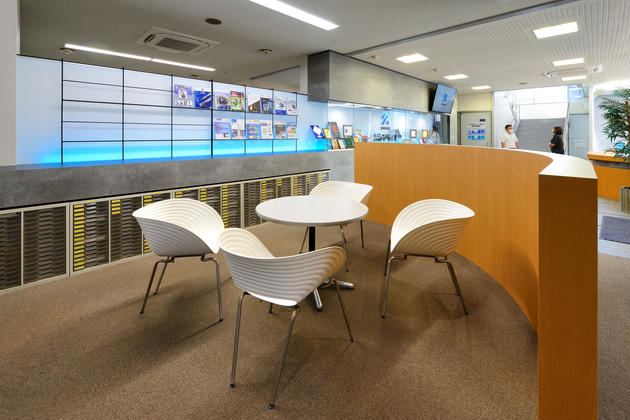 入って正面のギャラリーも担うデザインウォールは、外壁にも使われるシャープな仕上げ材と ワイドに広がるアクリル板の裏に好きな色に調整できるLEDを仕込み近未来的な雰囲気にもなっています。
