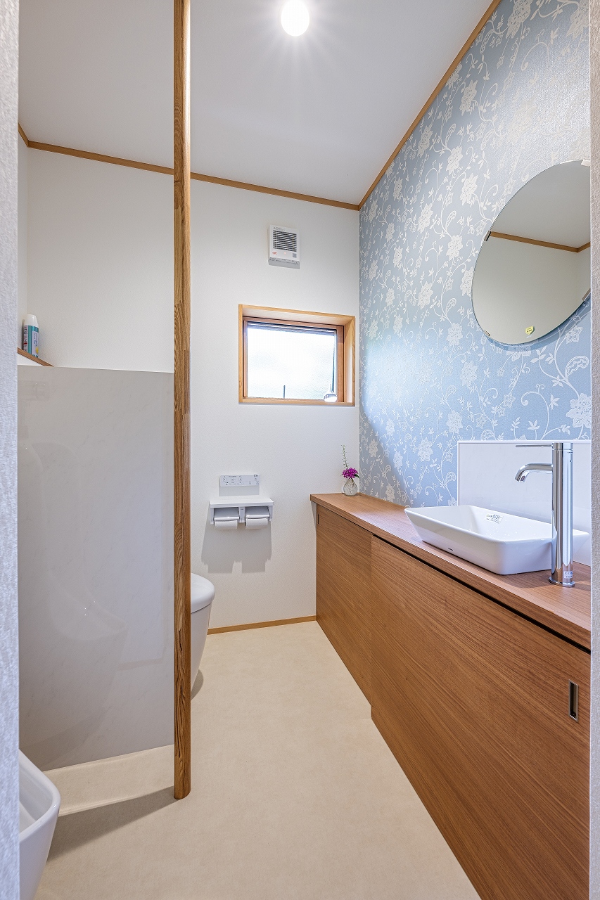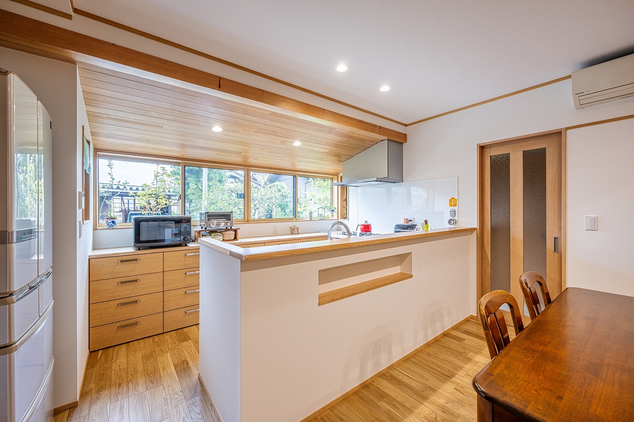 L型キッチンとカップボードをコの字型に配置することで明るさを確保し、作業効率もUP。