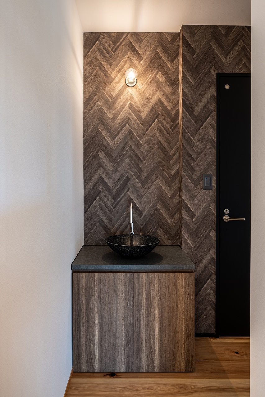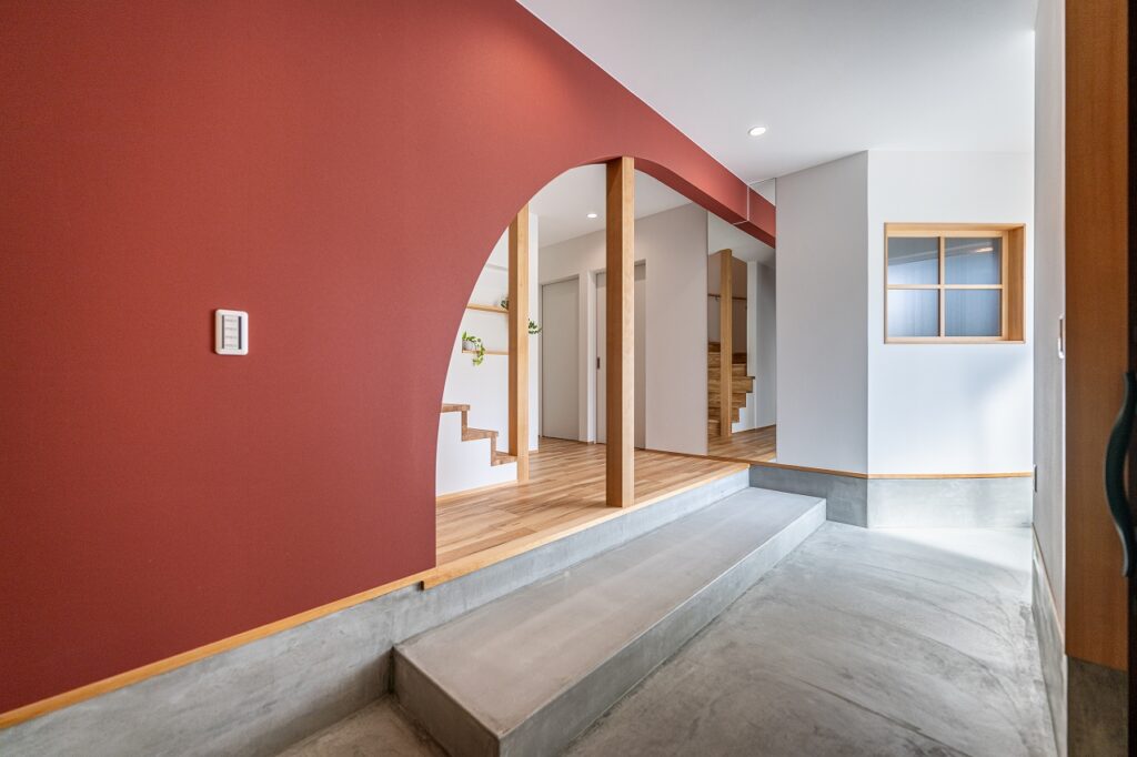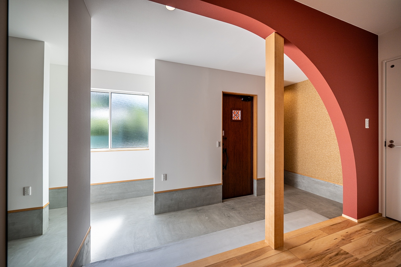 構造上抜けない柱もデザインの一部にすれば、素敵な土間玄関へ