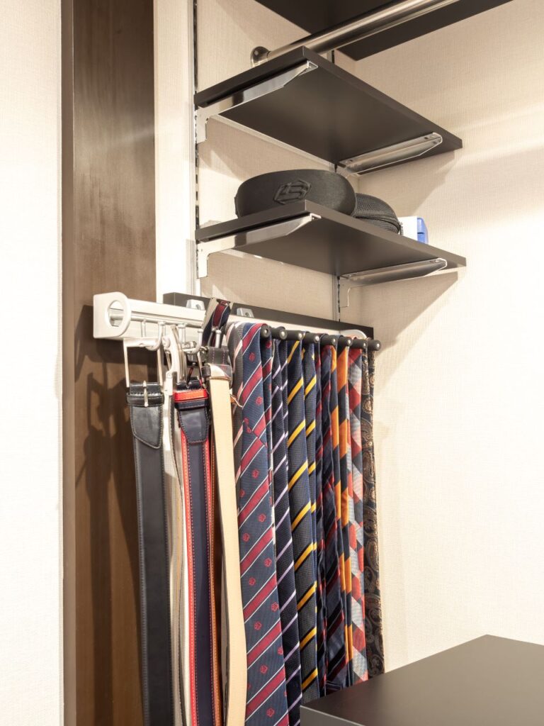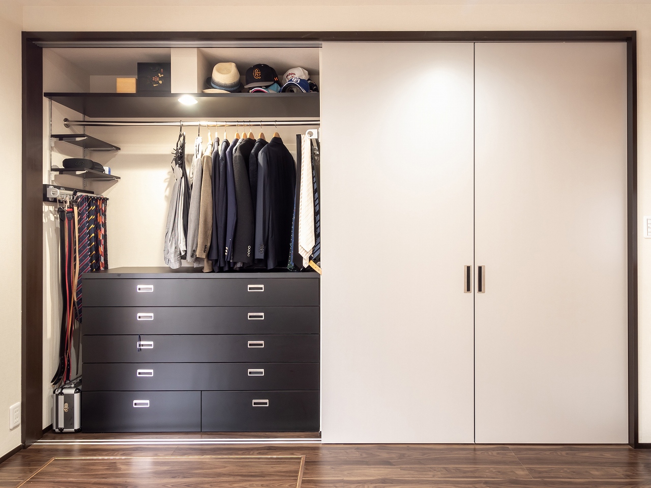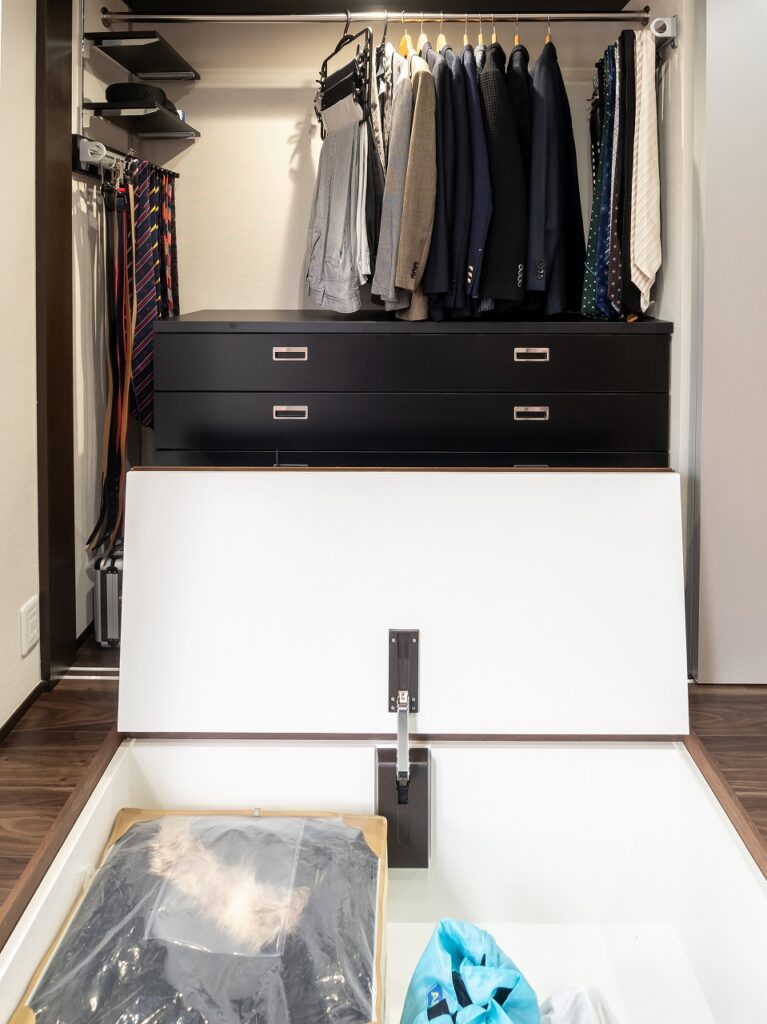 たくさんのベルトやネクタイを収納できる金物や、床下に約1畳の収納庫も設置。