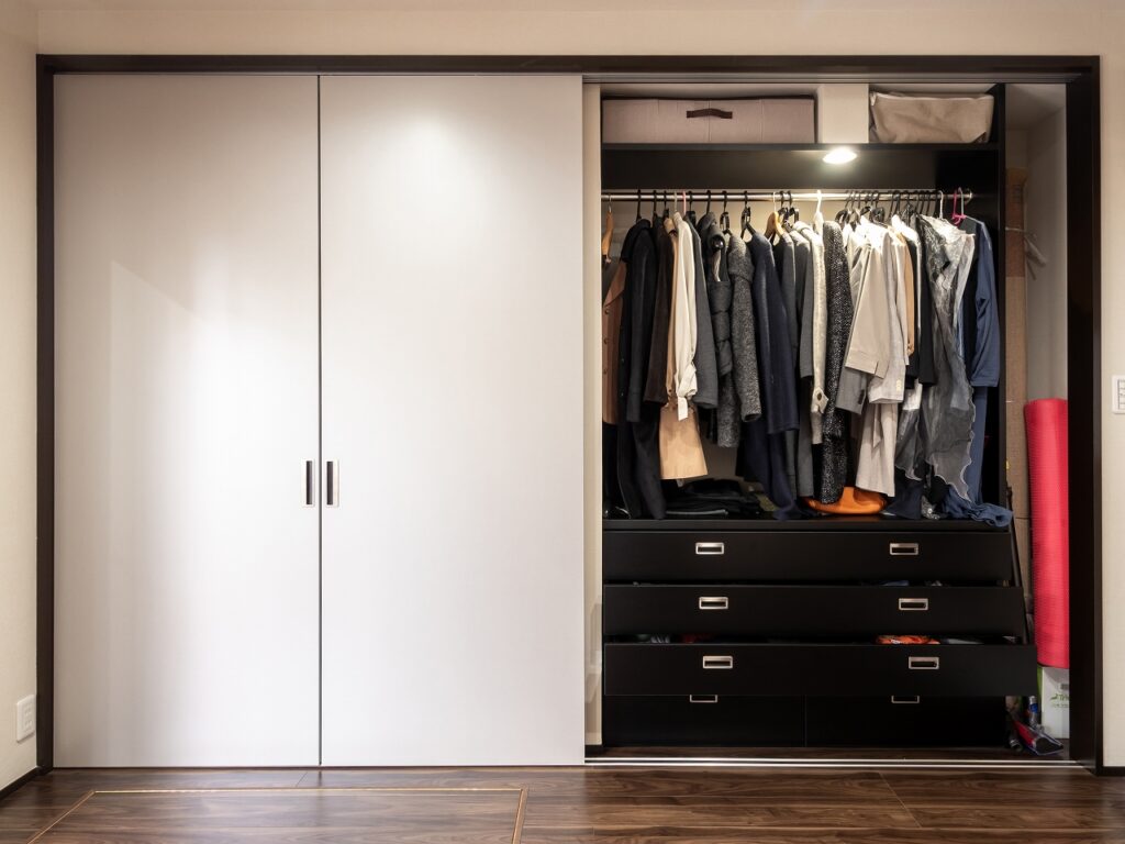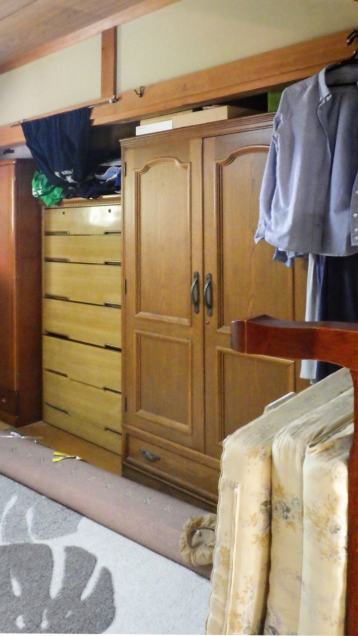 施工前は6畳のお部屋にタンスが5竿。その隣で就寝されているということで、大変危険!な状態でした。 既存のタンス置き場だった場所にご主人様のたくさんの洋服を機能的に収納できる造作収納をご提案させていただきました。