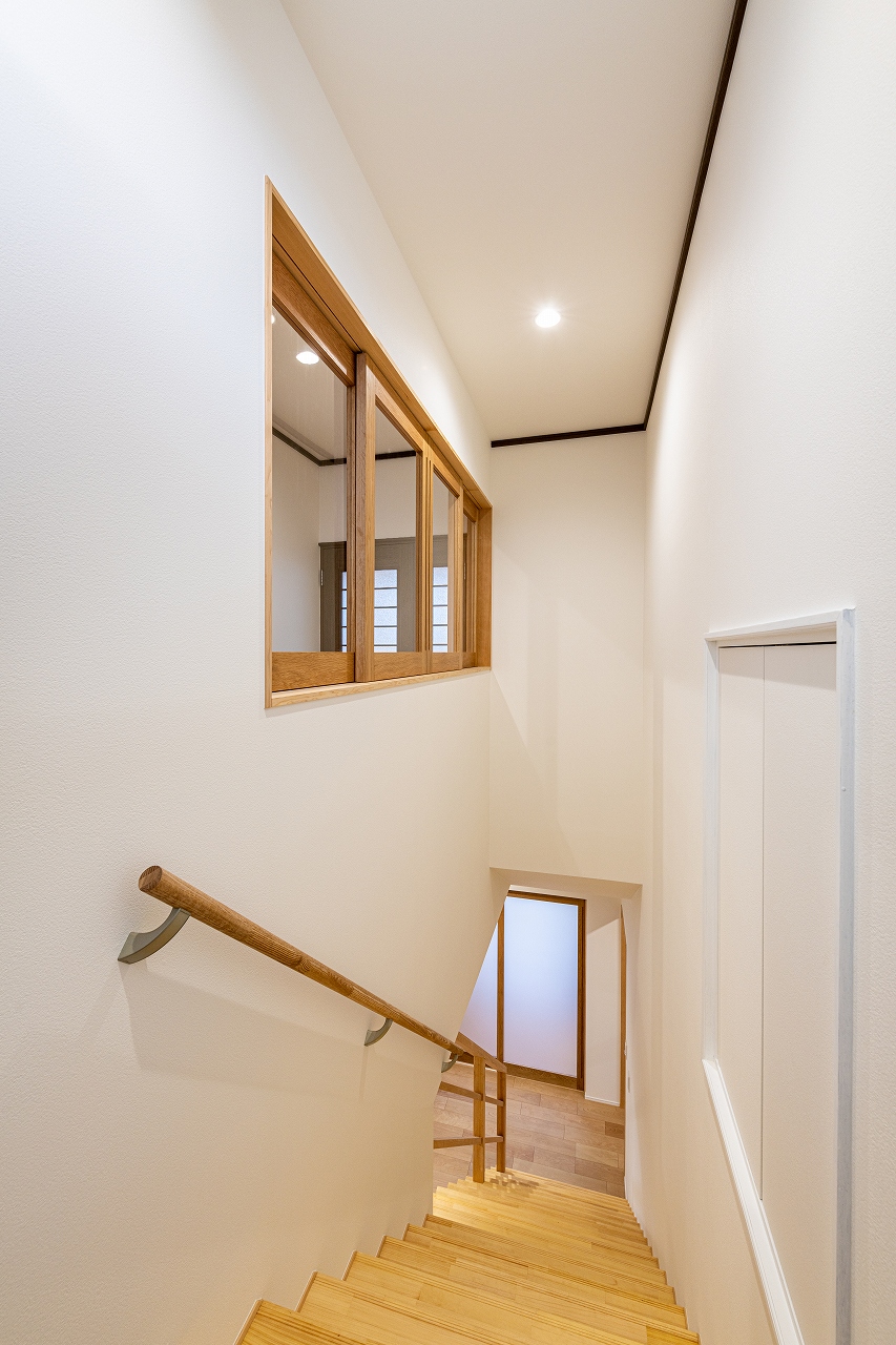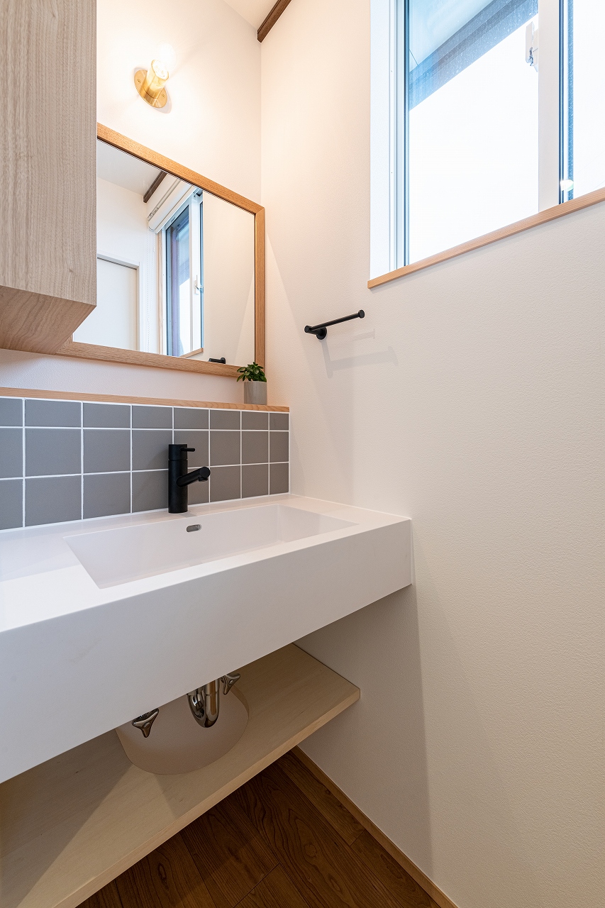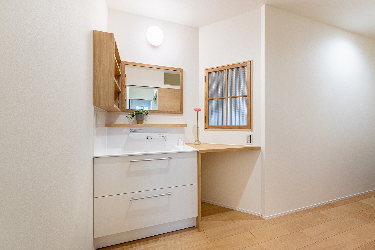 チェッカーガラスの室内窓から、リビングのやわらかい光が差し込む洗面コーナー