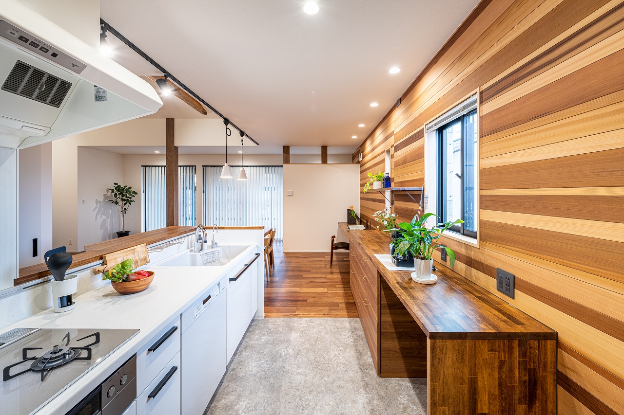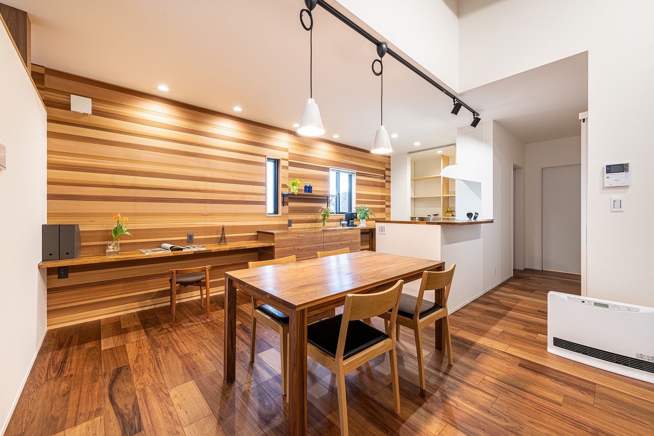床や家具の色を濃いめに統一し、シックな雰囲気の子世帯LDK。レッドシダーの壁が広い空間のアクセントに。