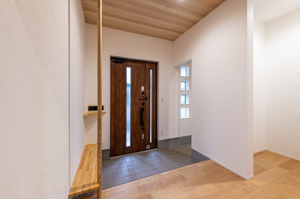 玄関にはたっぷり収納できるシューズクロークと、靴の脱ぎ履きがしやすいベンチを新設