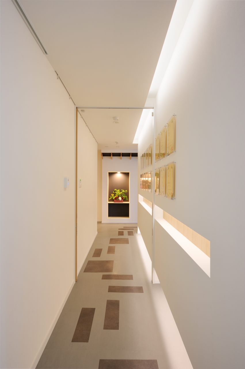 デザインモチーフには「日本建築の茶室」「露地」を採用しました。 世界中からやってくる皆様に<ジャパニーズおもてなし>を添えさせていただきたいからです。 玄関から2階の応接室までの長いアプローチを活かし、茶道のストーリー(外露地→内露地→茶室)を空間に投影することで、茶道のおもてなしの関係性を応接室でのお客様との出会いに重ねています。